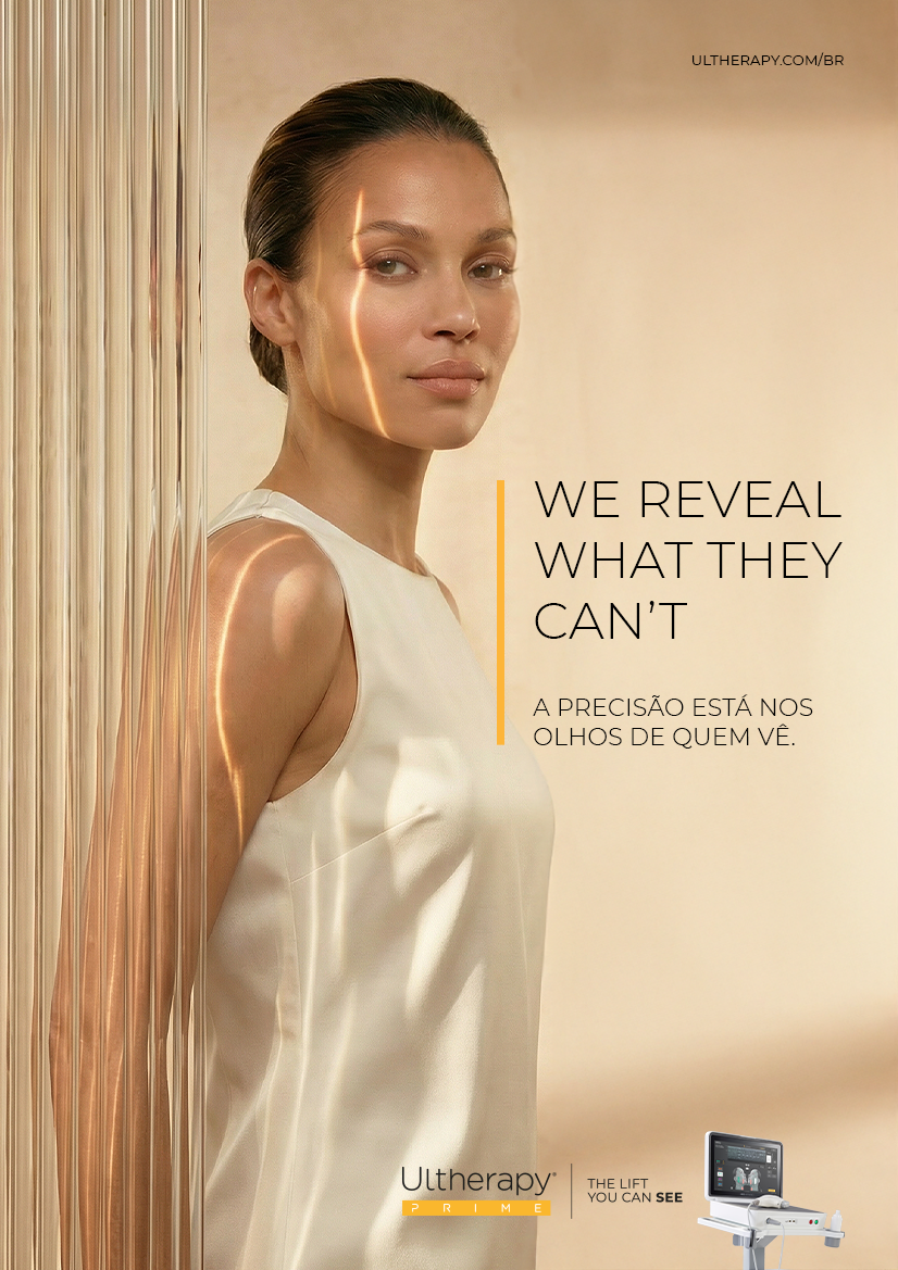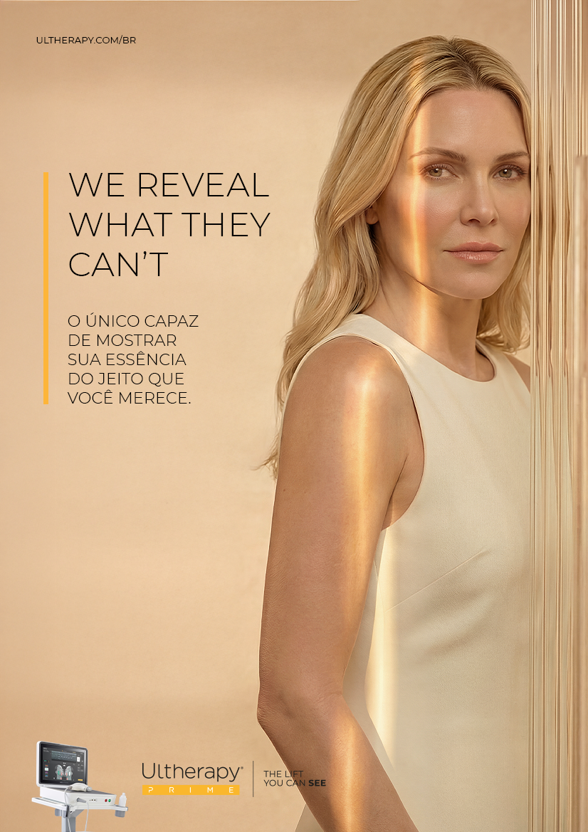 Para Ultherapy®, partimos dessa tensão para construir um território claro e proprietário: naturalidade guiada por precisão. Assim nasceu WE REVEAL WHAT THEY CAN’T. Transformamos a visualização em tempo real no grande símbolo da campanha e criamos um universo visual feito de camadas, vidro e luz dourada para traduzir profundidade, ciência e controle. A estratégia conectou branding e negócio em um mesmo fluxo, com filme hero, OOH premium, experiências para HCPs, toolkit clínico, régua de CRM e programas de incentivo comercial.